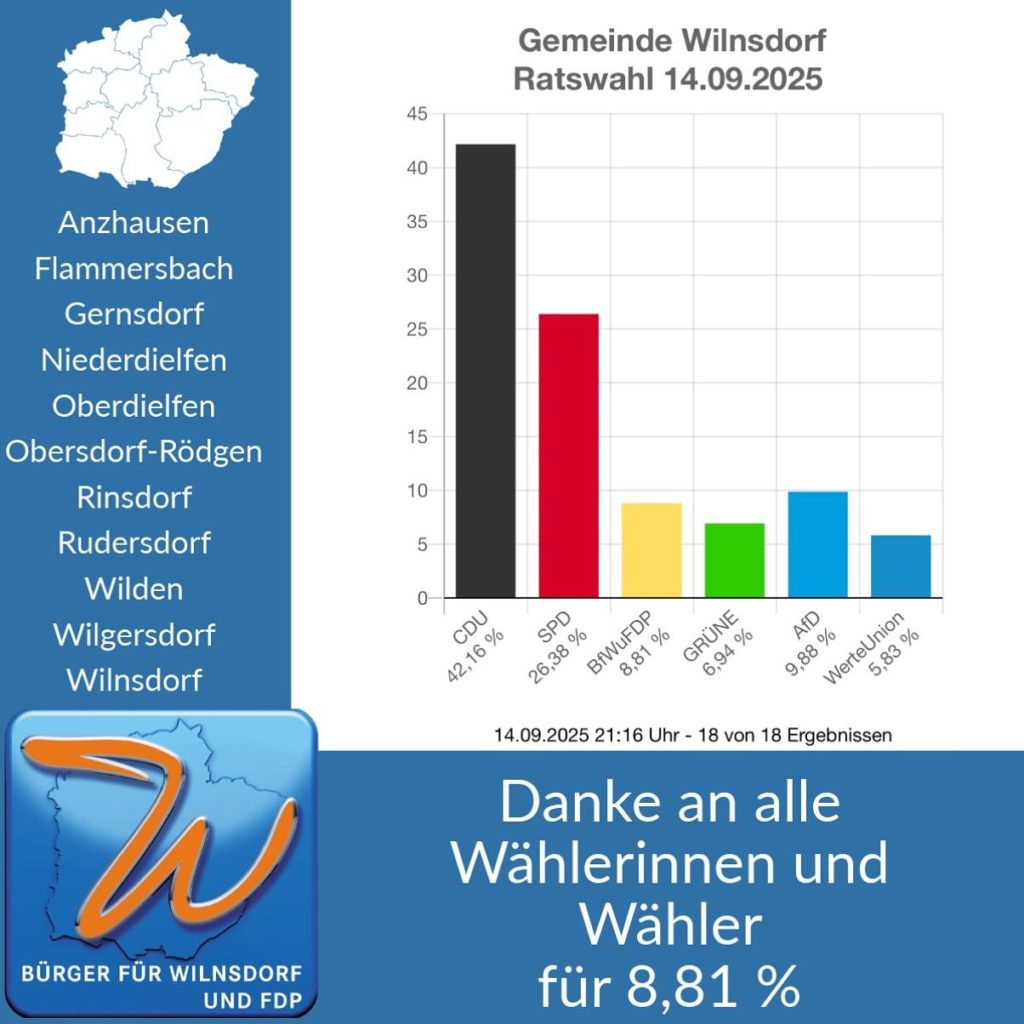 Wir danken allen Wählerinnen und Wählern für 8,81 % in der Gemeinde Wilnsdorf.